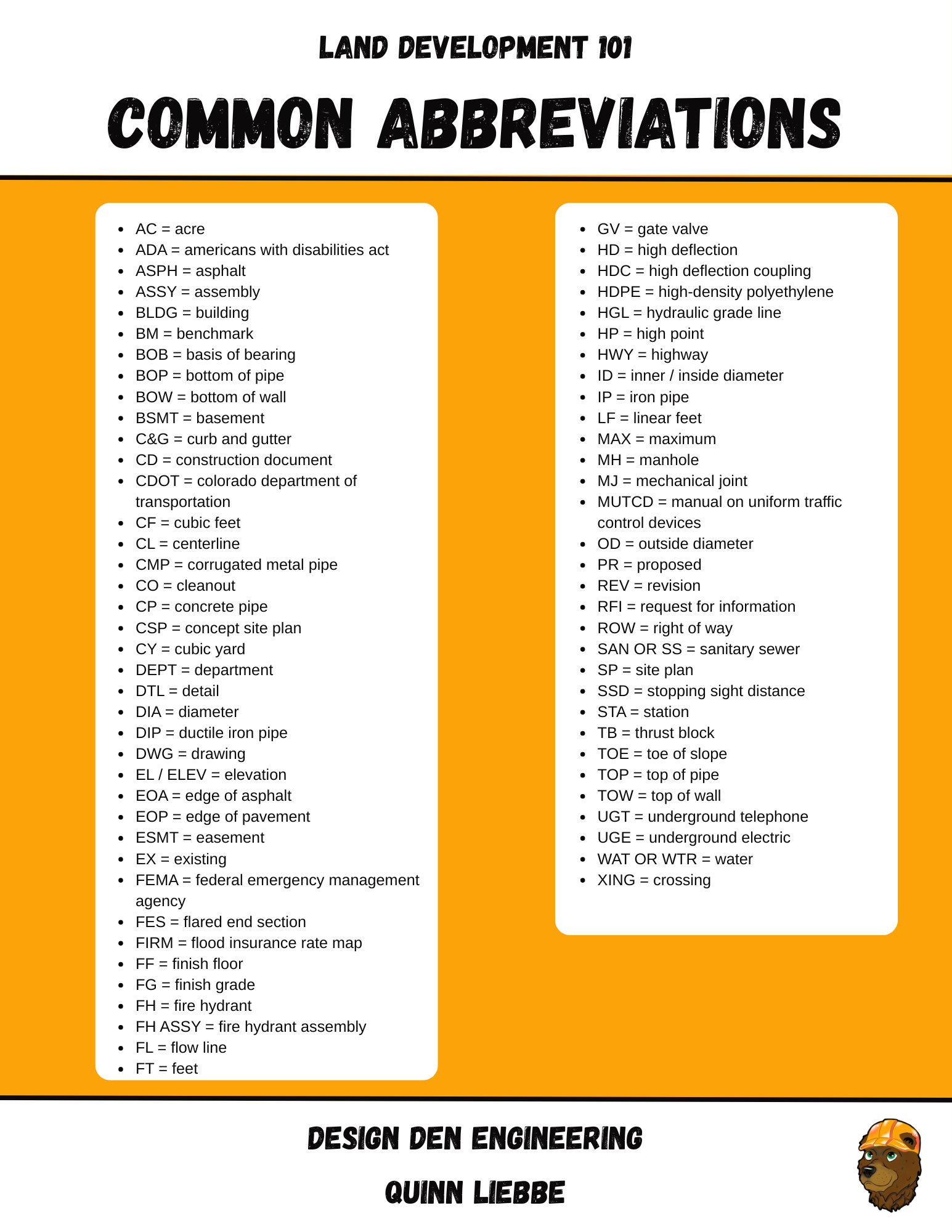 Welcome to the Design Den. A home for all civil design engineers. Please take the time to explore the website, and please reach out if you don’t see what you are looking for. I would be glad to add any missing information.